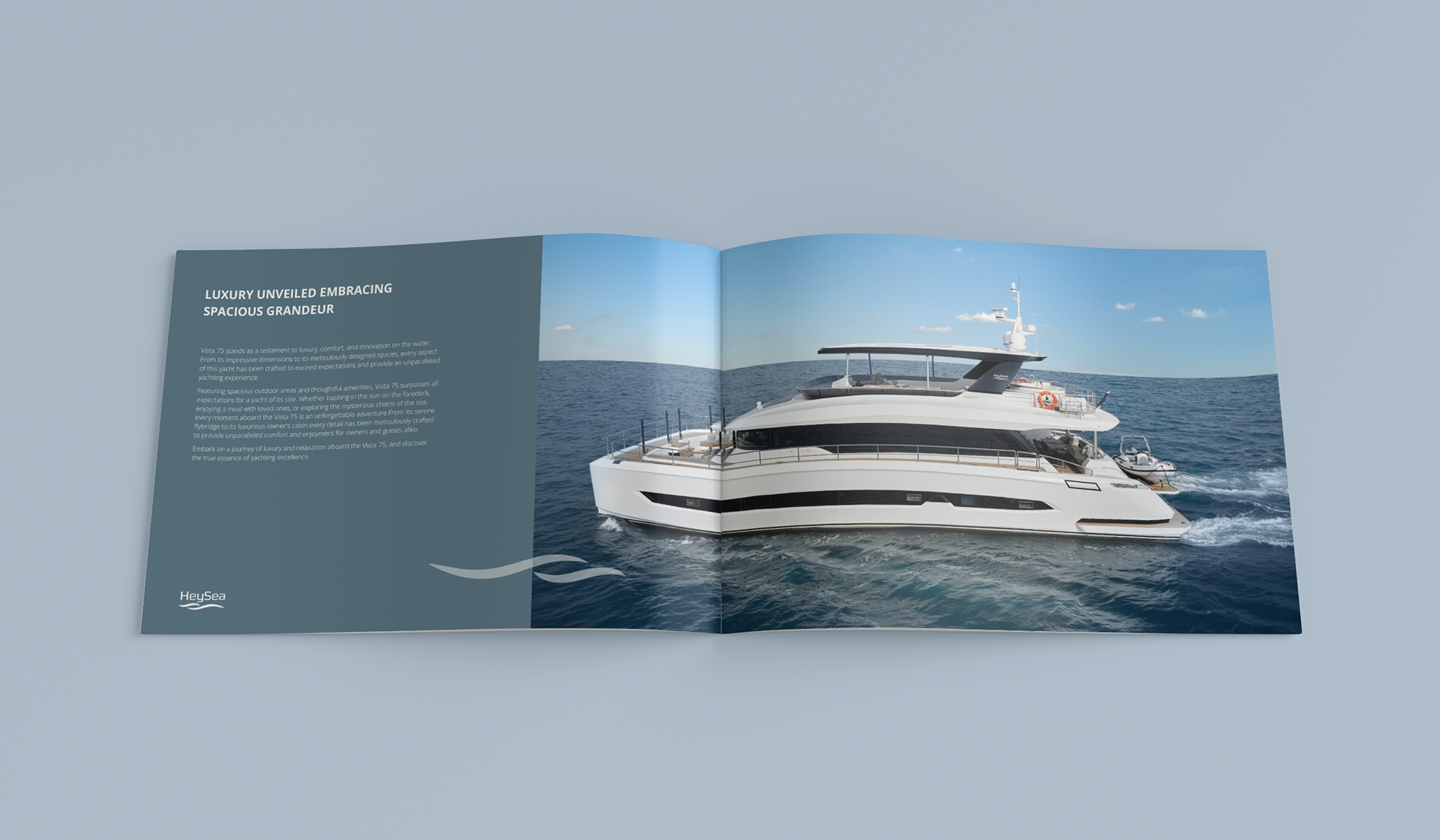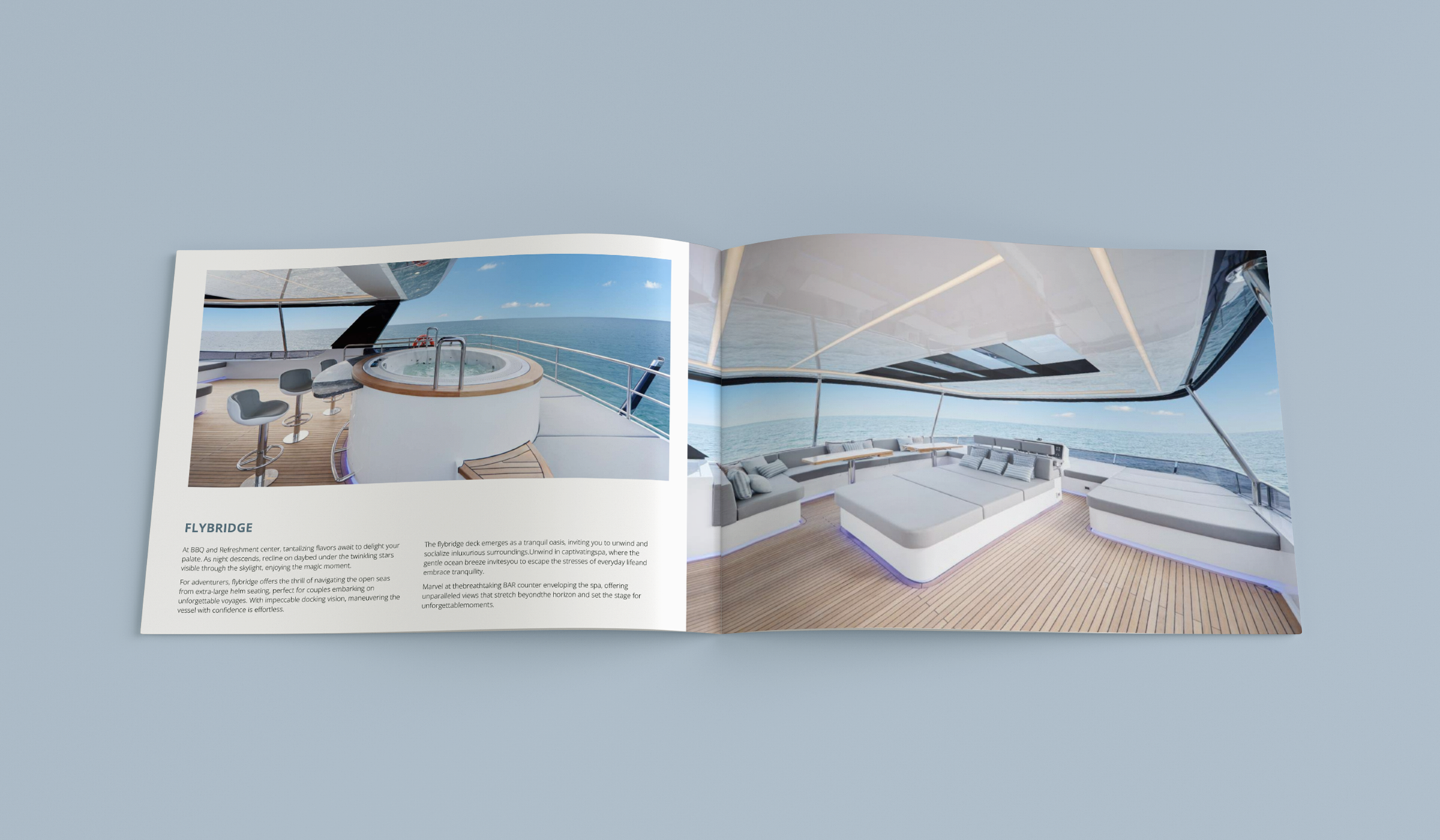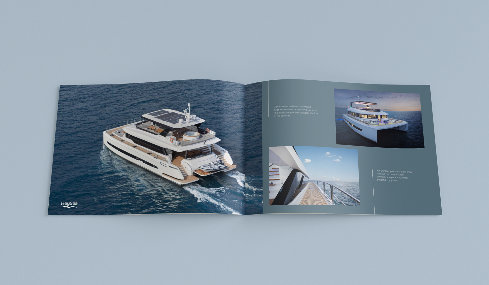 This brochure was designed as a premium promotional piece for a luxury yacht, highlighting its elegant design, advanced features, and high-end lifestyle experience. The layout combines clean visuals with engaging content to showcase the yacht’s performance, comfort, and craftsmanship, providing potential clients with a clear and compelling presentation of the vessel.