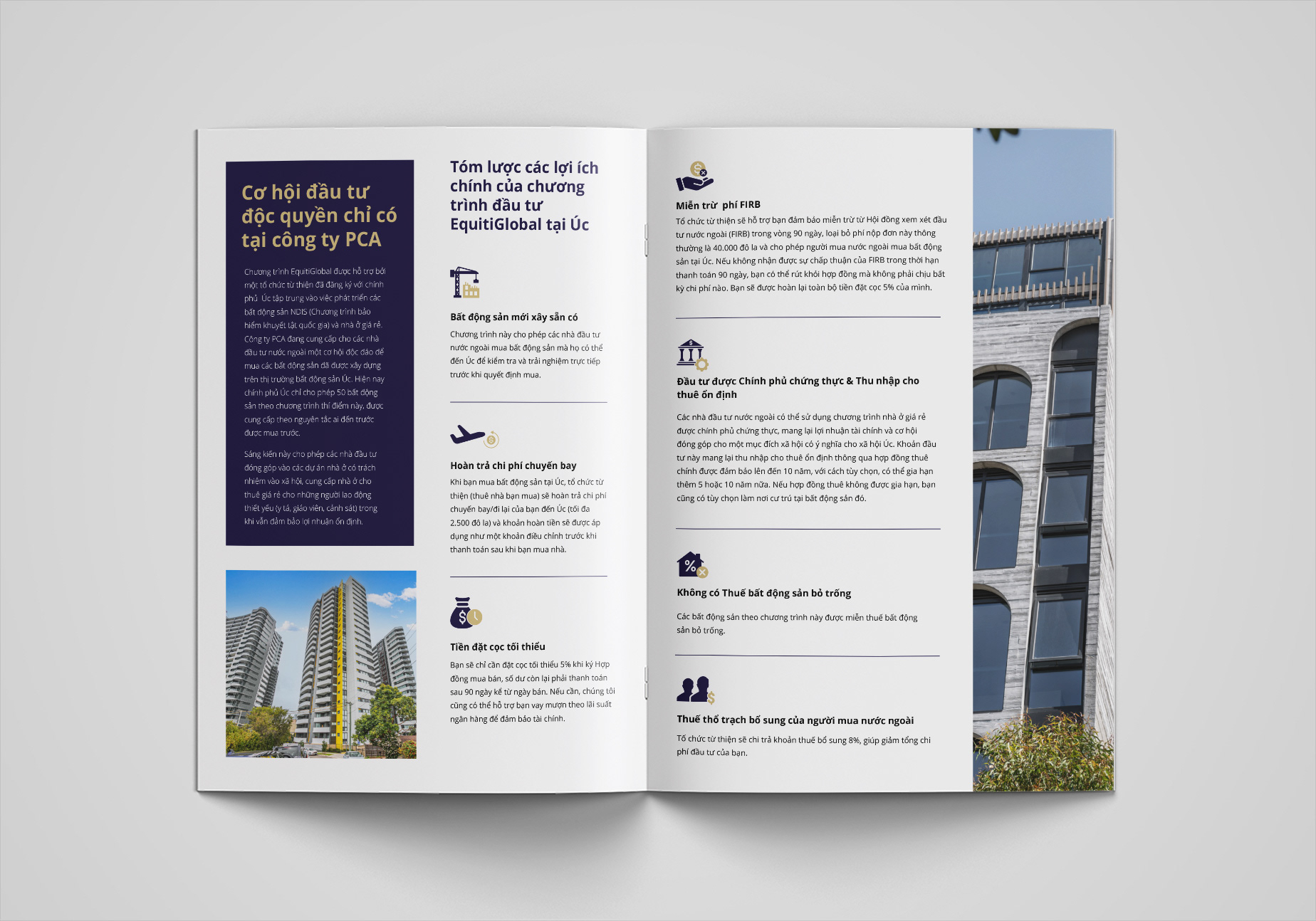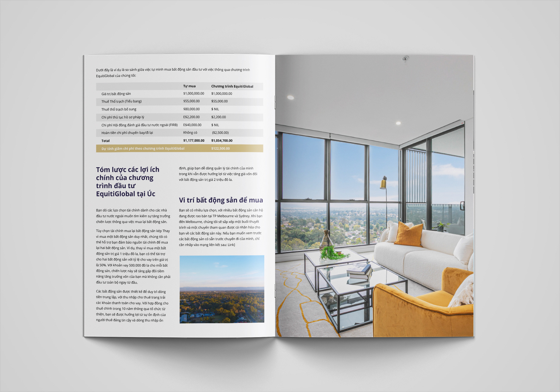 The design highlights premium Australian properties while integrating visual elements familiar to Vietnamese audiences, ensuring clarity and appeal across both cultures. The layout combines clean typography, elegant imagery, and a balanced color palette to reflect the brand’s sophistication and reliability.